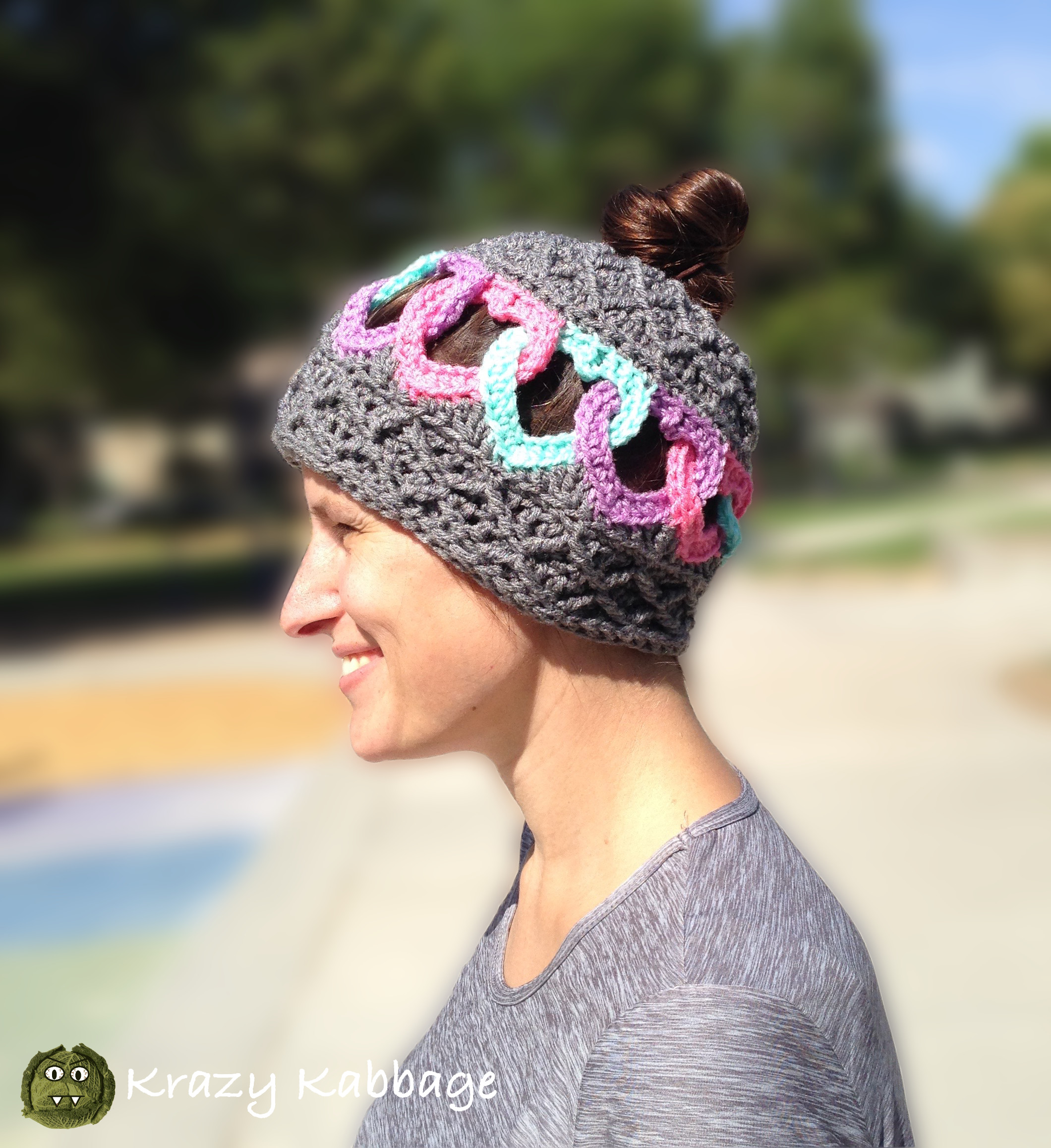 Linked Hearts and Diamonds Messy Bun Beanie Hat